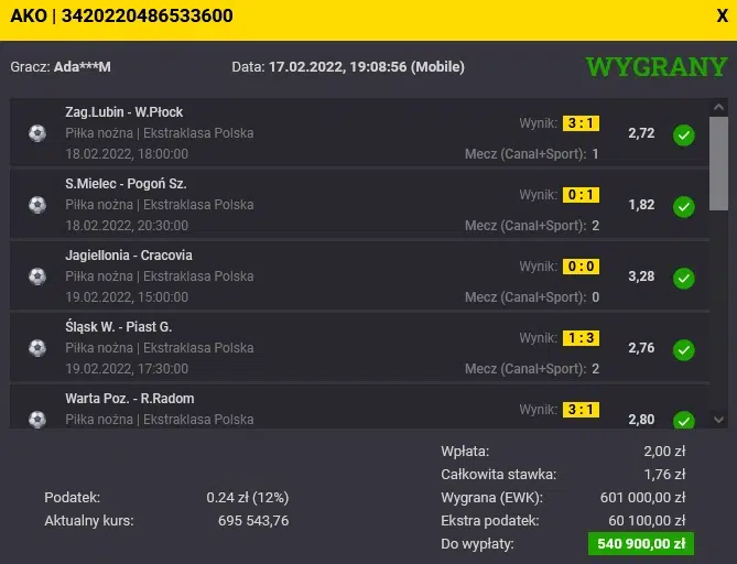 17 lutego 2022 roku jeden z klientów bukmachera Fortuna obstawił kupon, dzięki któremu uzyskał niesamowitą wygraną wynoszącą aż 601 tys. zł! Stawka jaka została włożona w ten kupon to zaledwie…