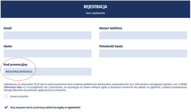 Kod promocyjny Ewinner należy podać już na pierwszej stronie formularza rejestracyjnego, w miejscu wskazanym poniżej: