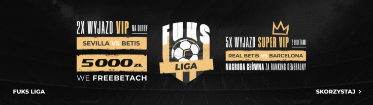 Polski legalny bukmacher Fuksiarz (oficjalny sponsor hiszpańskiej LaLiga w Polsce) uruchomił wczoraj ciekawą promocję „FUKS Liga”, która ma charakter rankingu dla najbardziej aktywnych graczy bukmachera. W pierwszej edycji zabawy możesz pojechać z Fuksiarzem na derbowy mecz Sevilla FC – Real Betis, zaś zwycięstwo w rankingu generalnym bukmacher nagrodzi wyprawą Super VIP dla 5 osób na Real Betis – FC Barcelona!