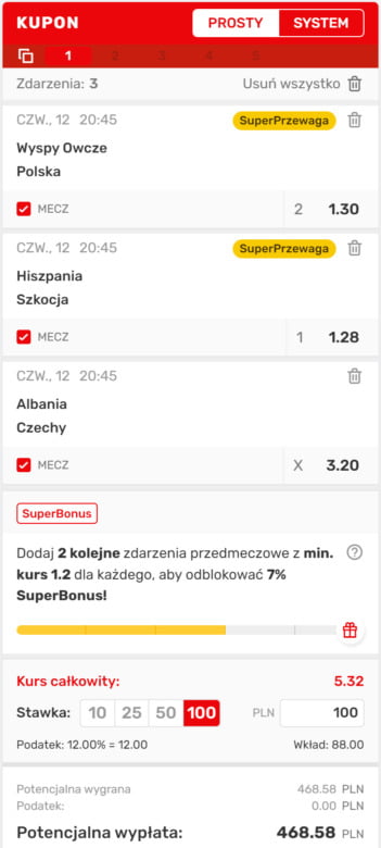 | Wyspy Owcze Polska | 12.10.2023 20:45 | 12.25 | 5.15 | 1.38 | 3.40 | 1.09 | 1.21 | 0.04%1.90% |