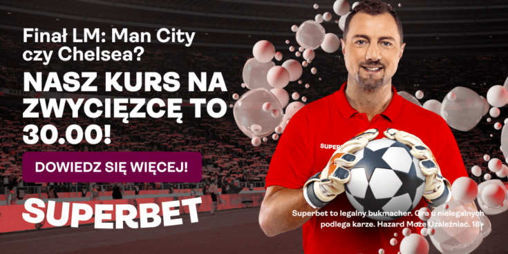 W finale Ligi Mistrzów wygra Manchester City czy FC Chelsea? W Superbet kurs na zwycięzcę tego starcia wynosi aż 30.00! Tak wysoki kurs dostępny jest w ramach specjalnej promocji dla nowych graczy.