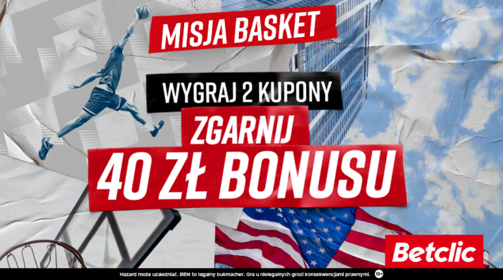 Rozgrywki najlepszej koszykarskiej ligi świata rozpoczęły się na dobre, a legalny bukmacher Betclic oferuje swoim graczom nową akcję promocyjną na mecze kosza – „Misję Basket”. W tej promocji każdy typer obstawiające rywalizację koszykarską, może otrzymać od Betclic 40 zł bonusu.