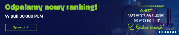 Bukmacher forBET odpala 3. edycję konkursu graczy obstawiających zakłady z oferty sportów wirtualnych. Zadaniem typerów jest uzbieranie jak największej liczby punktów w okresie od 18 stycznia do 7 lutego 2021 r. Na zwycięzcę rankingu czeka nagroda główna w postaci 10 000 PLN w gotówce! Cała pula nagród w tej edycji rankingu wynosi 30 000 PLN.