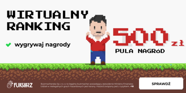 Obstawiając zakłady na sporty wirtualne otrzymujecie od Fuksiarza specjalne punkty. Za każdą złotówkę wydaną na zakłady wirtualne, bukmacher przyznaje 1 pkt. Im więcej punktów, tym większa szansa na podium w Wirtualnym Rankingu. Aby zdobywać punkty, wystarczy stawiać kupony SOLO lub AKO z oferty sportów wirtualnych Fuksiarza za dowolną stawkę. Gracze, którzy uplasują się na najwyższych miejscach w Wirtualnym Rankingu, wygrają Freebety.